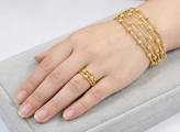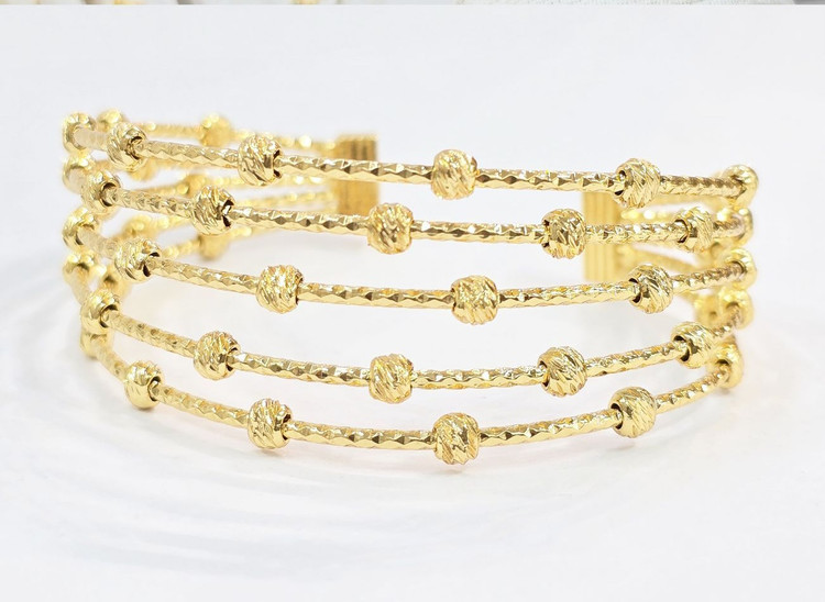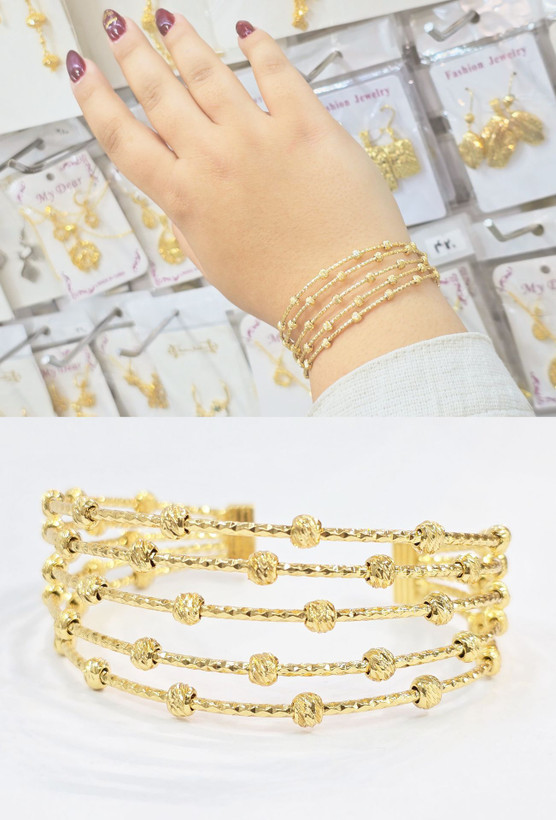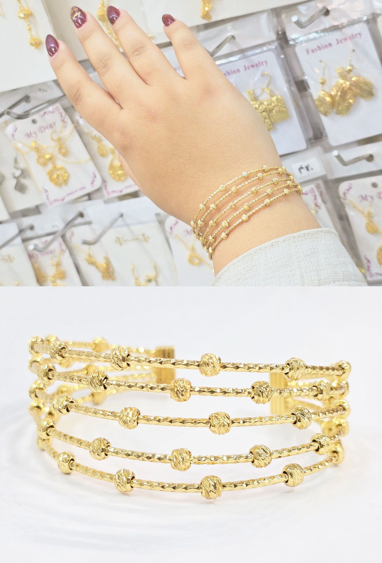 این بنگل شیک از برند **NYH** با طراحی چندردیفه و گویهای تراشخورده، دقیقا مشابه طلا جلوهای بسیار ظریف و خاص روی دست ایجاد میکند. کیفیت ساخت آن مشابه مدلهای پرفروش برند **ژوپینگ** است و بهدلیل متریال باکیفیت و پرداخت دقیق، درخشش زیبایی دارد.
