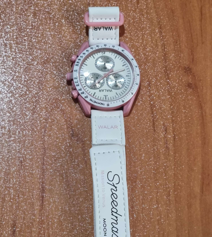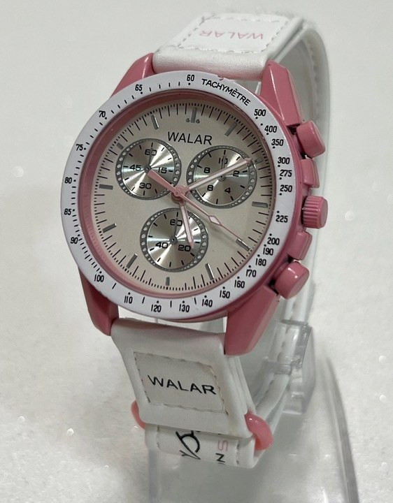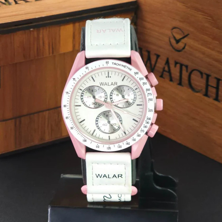 ساعت مچی Wallar رنگ سفید و صورتی، با طراحی مدرن و الهامگرفته از امگا سواچ، گزینهای مناسب برای استایل اسپرت و روزمره است. رنگ جذاب صورتی آن را به انتخابی مناسب برای خانمها و آقایانی تبدیل میکند که به رنگهای خاص علاقه دارند. بند چرمی، عقربه شبنما و موتور کوارتز دقیق، این مدل را به ساعتی خوشساخت و کاربردی تبدیل کرده است.
