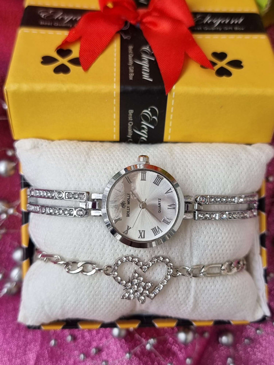 عنوان محصول: ست هدیه ساعت مچی زنانه و دستبند نگیندار (طرح کلاسیک مجلسی)