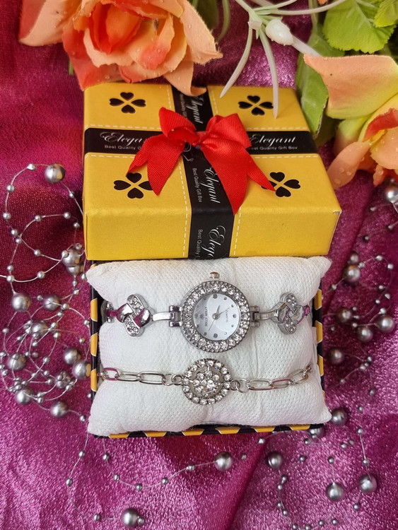 اگر به دنبال تکمیل استایل مجلسی خود هستید یا میخواهید هدیهای ماندگار تهیه کنید، این ست ساعت و دستبند بهترین انتخاب برای شماست. طراحی این محصول با الهام از جواهرات لوکس انجام شده و ترکیب رنگ نقره ای با صفحه سفید، جلوهای بینظیر به دستان شما میبخشد.