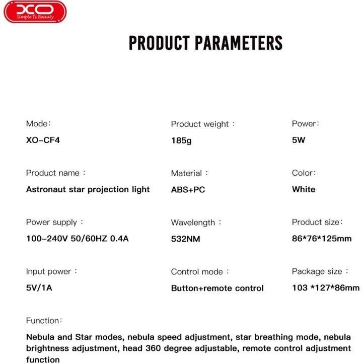 • تعداد حالات نور: 8 حالت (شامل آسمان پرستاره، سحابی رنگارنگ و حالتهای ترکیبی)