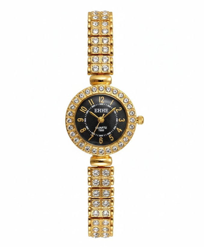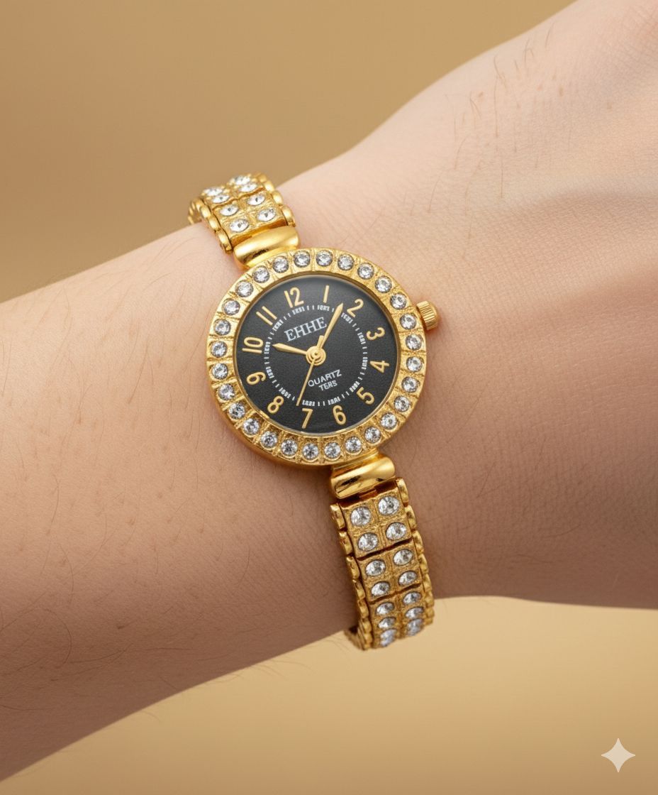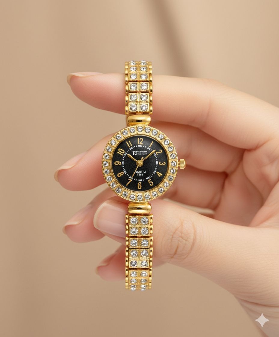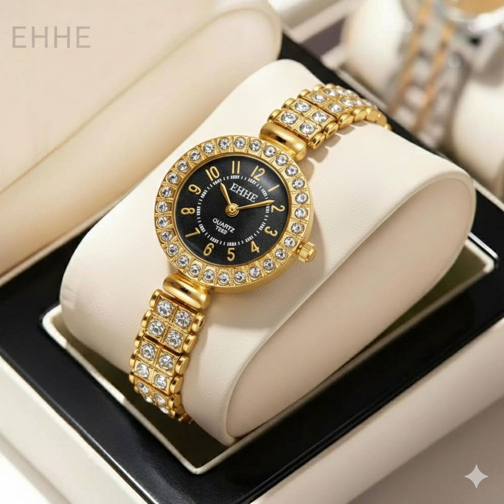 این مدل شیک و زیبا از برند **EHHE** با صفحه مشکی و بدنه طلایی، جلوهای متفاوت و لوکس روی دست ایجاد میکند. طراحی نگینکاریشده دور قاب و بند، این ساعت را به یک اکسسوری چشمگیر و مناسب برای استایلهای رسمی و روزمره تبدیل کرده است.